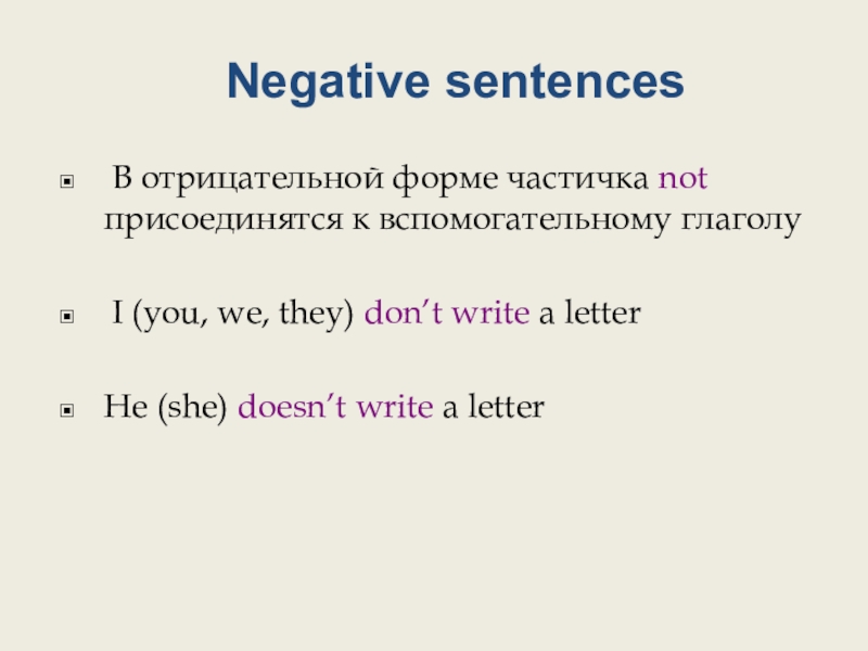 Negative sentences В отрицательной форме частичка not присоединятся к вспомогательному глаголу I (you, we, they) don’t write
