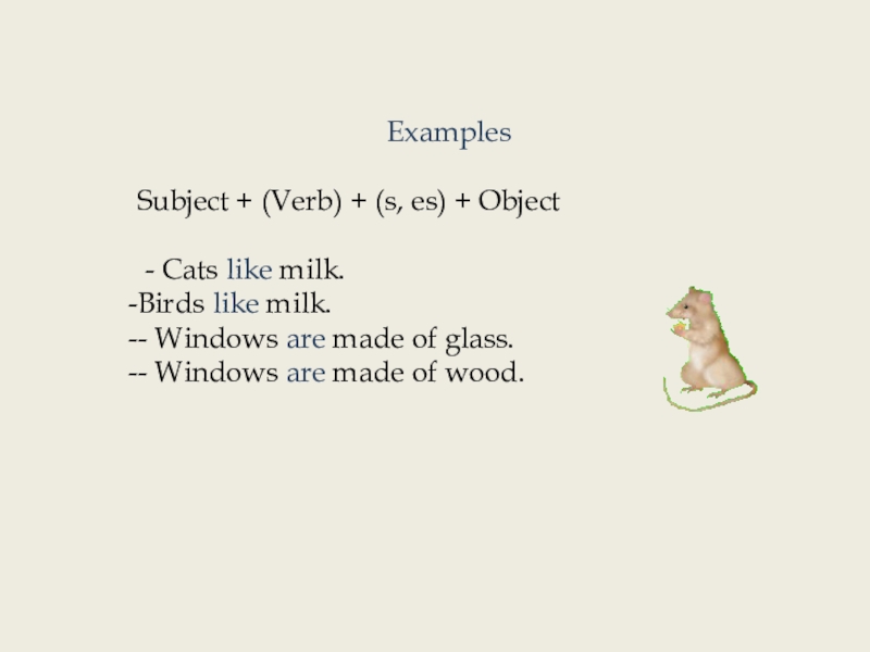 Examples Subject + (Verb) + (s, es) + Object - Cats like milk.Birds like milk.- Windows are