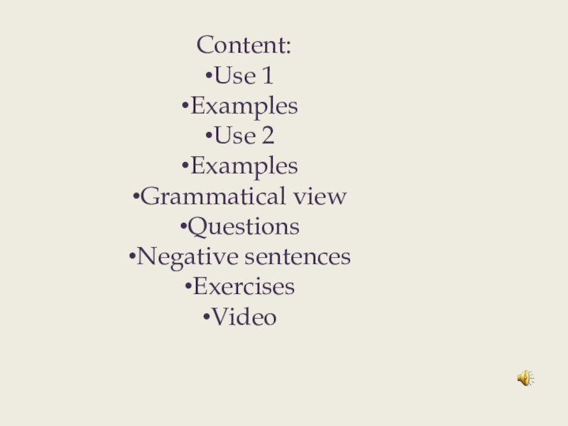 Content:Use 1ExamplesUse 2ExamplesGrammatical viewQuestionsNegative sentencesExercisesVideo