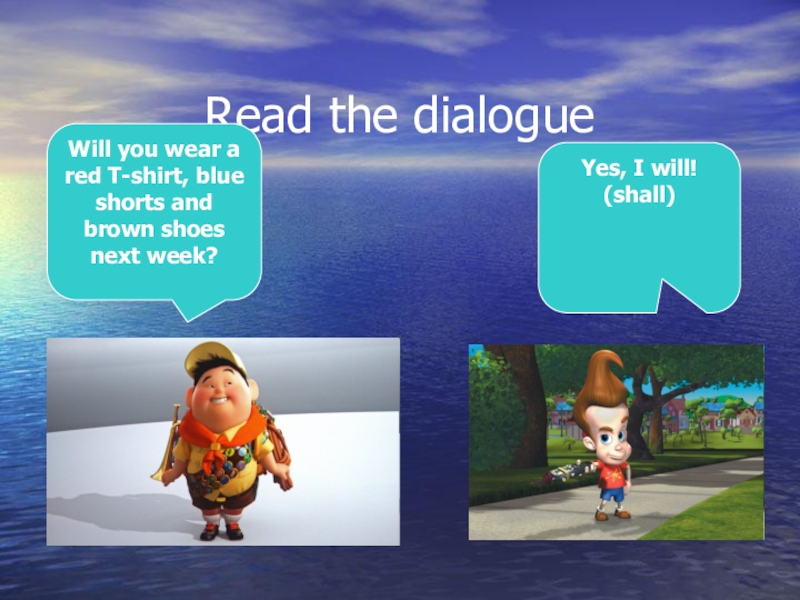 Read the dialogueWill you wear a red T-shirt, blue shorts and brown shoes next week?Yes, I will!