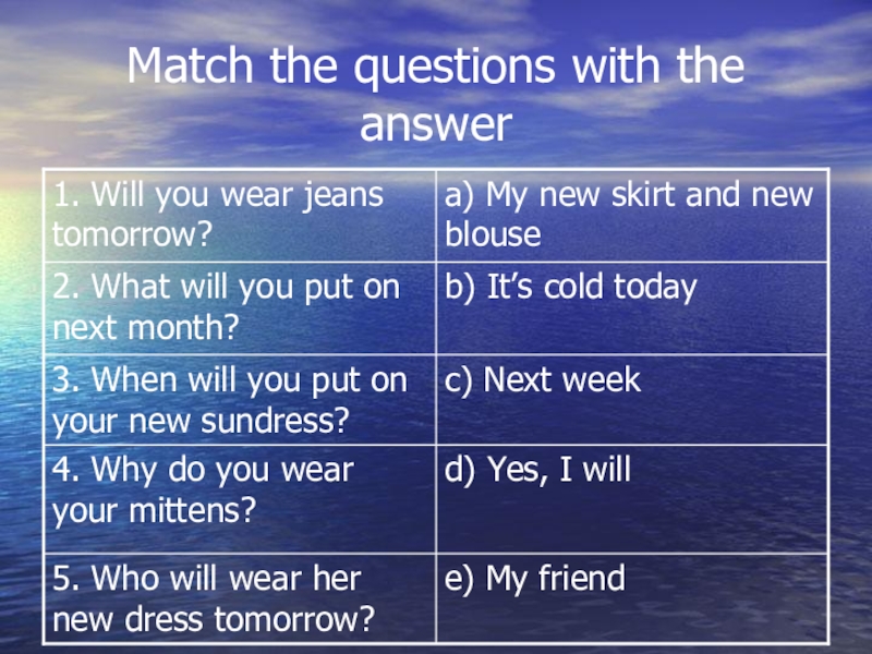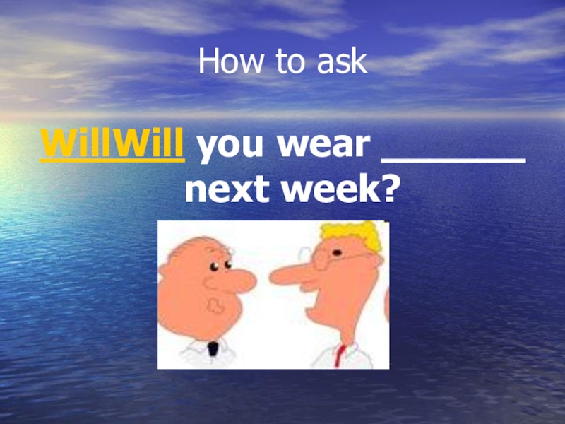 TaskMake up your own dialogue:Ask your partner what will he wear next weekAnswer your partner’s questions negative