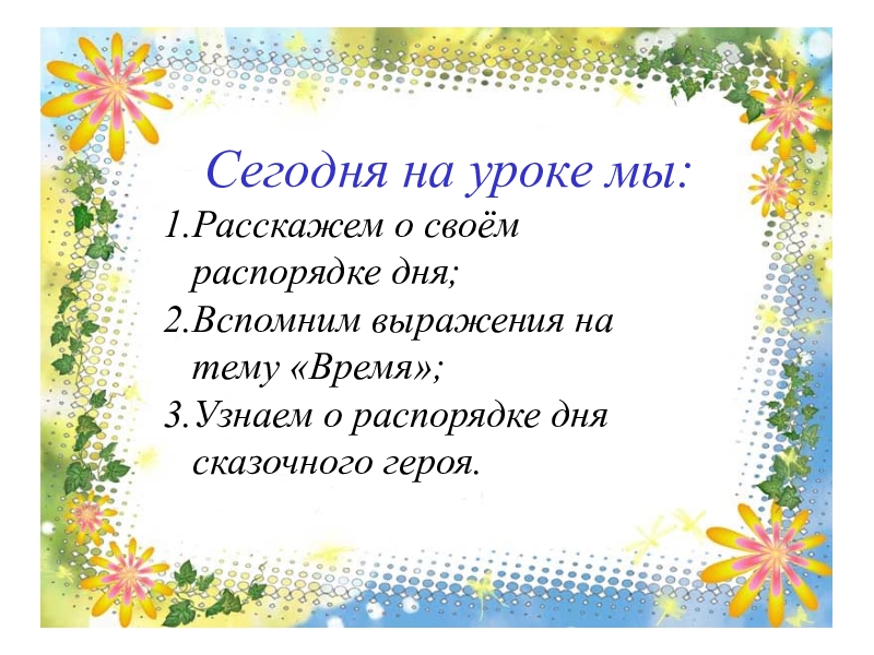 Сегодня на уроке мы:Расскажем о своёмраспорядке дня; Вспомним выражения на тему «Время»;Узнаем о распорядке днясказочного героя.