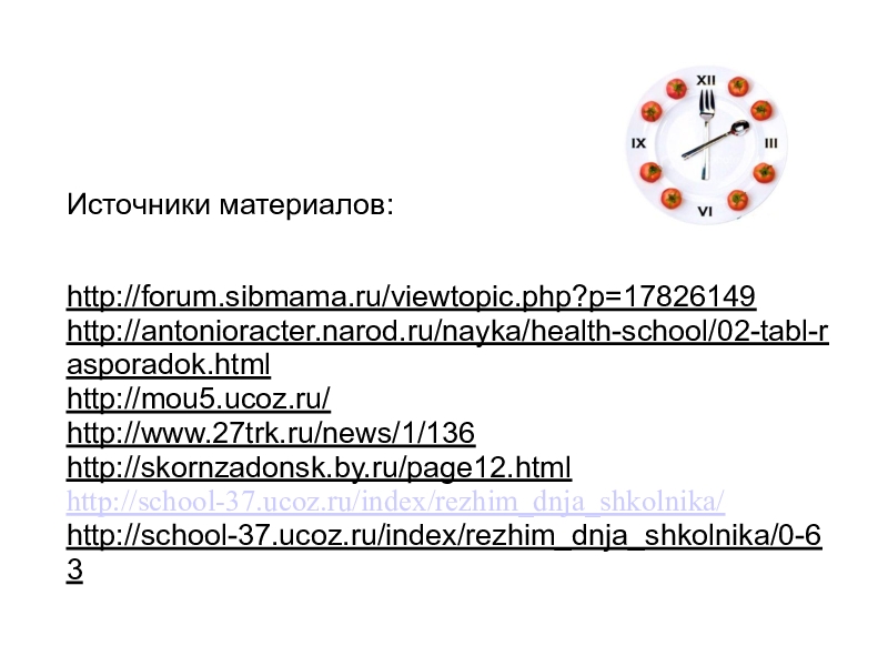 Источники материалов:  http://forum.sibmama.ru/viewtopic.php?p=17826149http://antonioracter.narod.ru/nayka/health-school/02-tabl-rasporadok.html http://mou5.ucoz.ru/ http://www.27trk.ru/news/1/136http://skornzadonsk.by.ru/page12.html http://school-37.ucoz.ru/index/rezhim_dnja_shkolnika/http://school-37.ucoz.ru/index/rezhim_dnja_shkolnika/0-63