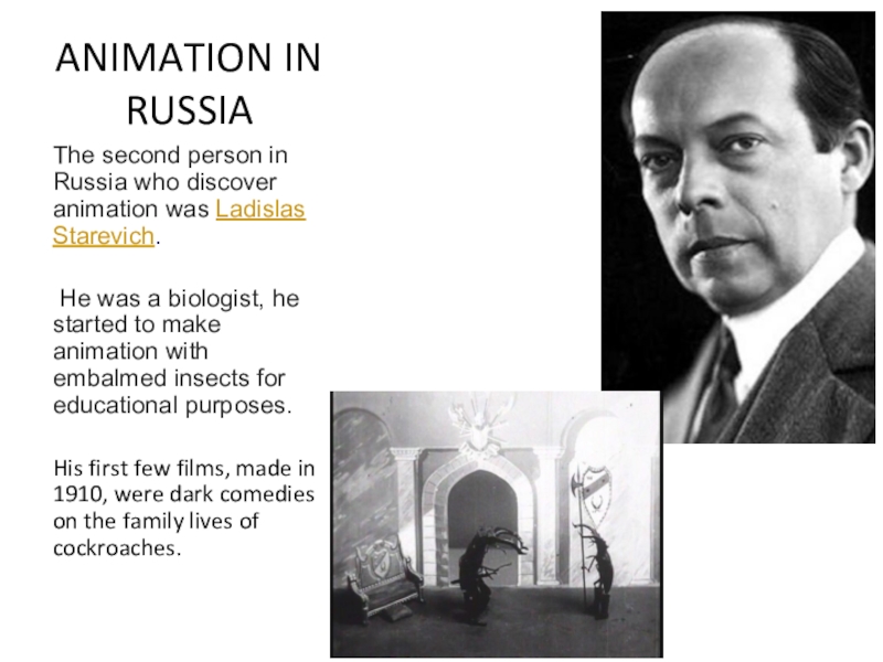 ANIMATION IN RUSSIAThe second person in Russia who discover animation was Ladislas Starevich. He was a biologist, he started