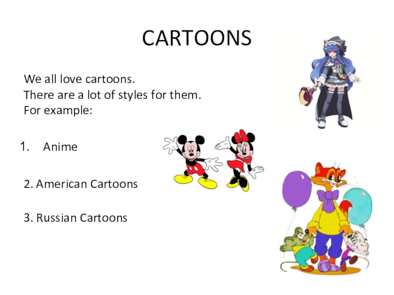 CARTOONSWe all love cartoons. There are a lot of styles for them. For example:Anime