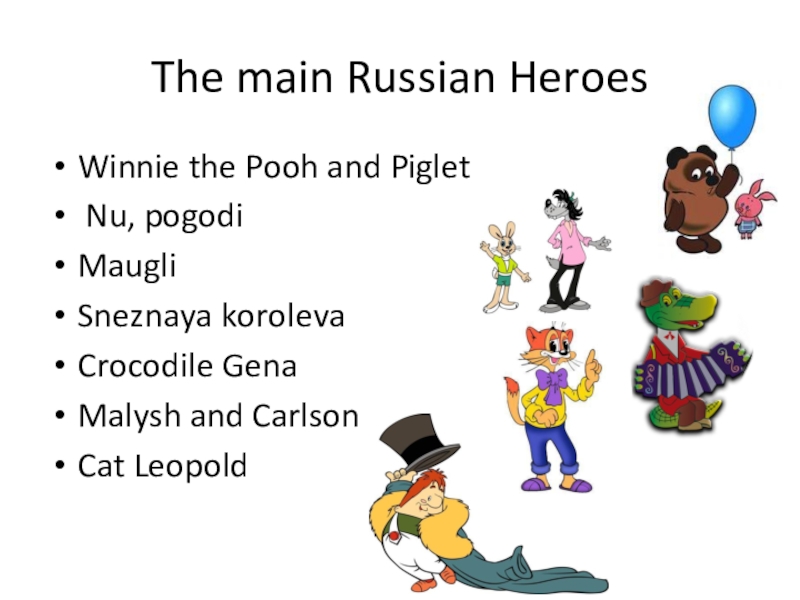 The main Russian HeroesWinnie the Pooh and Piglet Nu, pogodi Maugli Sneznaya korolevaCrocodile GenaMalysh and CarlsonCat Leopold