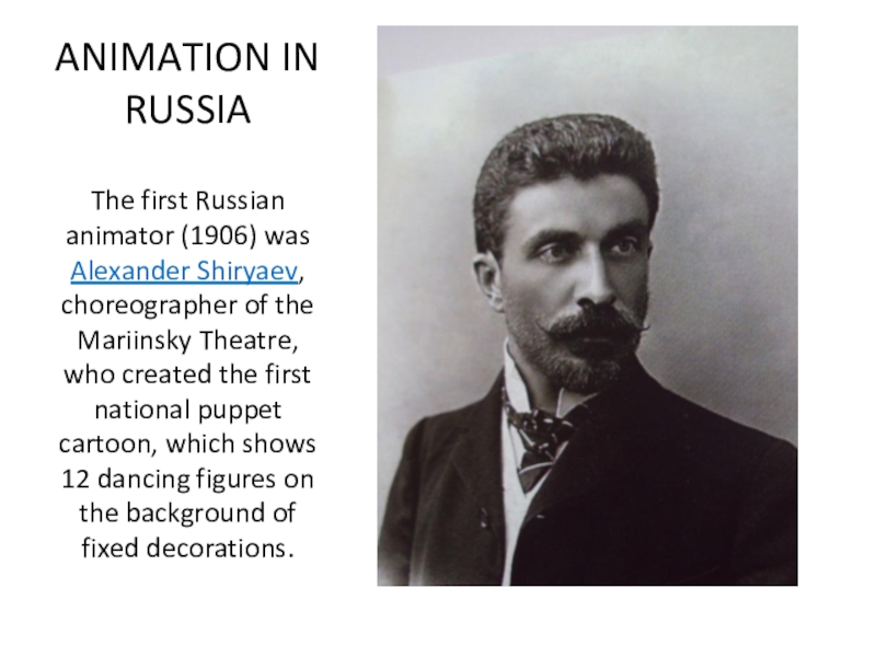 ANIMATION IN RUSSIAThe first Russian animator (1906) was Alexander Shiryaev, choreographer of the Mariinsky Theatre, who created