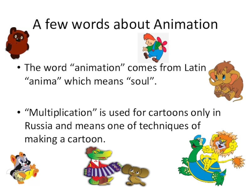 A few words about AnimationThe word “animation” comes from Latin “anima” which means “soul”.“Multiplication” is used for cartoons only in Russia and means one of techniques of making a cartoon.