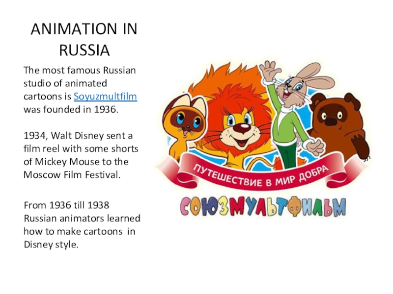 ANIMATION IN RUSSIAThe most famous Russian studio of animated cartoons is Soyuzmultfilm was founded in 1936.