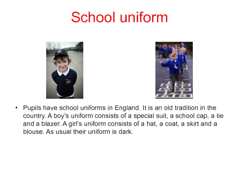 tradition in the country. A boy’s uniform consists of a special suit, a school cap, a tie and a blazer. A girl’s uniform consists of a hat, a coat, a skirt and a blouse. As usual their uniform is dark.