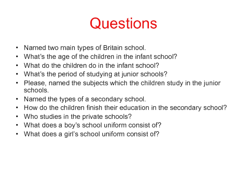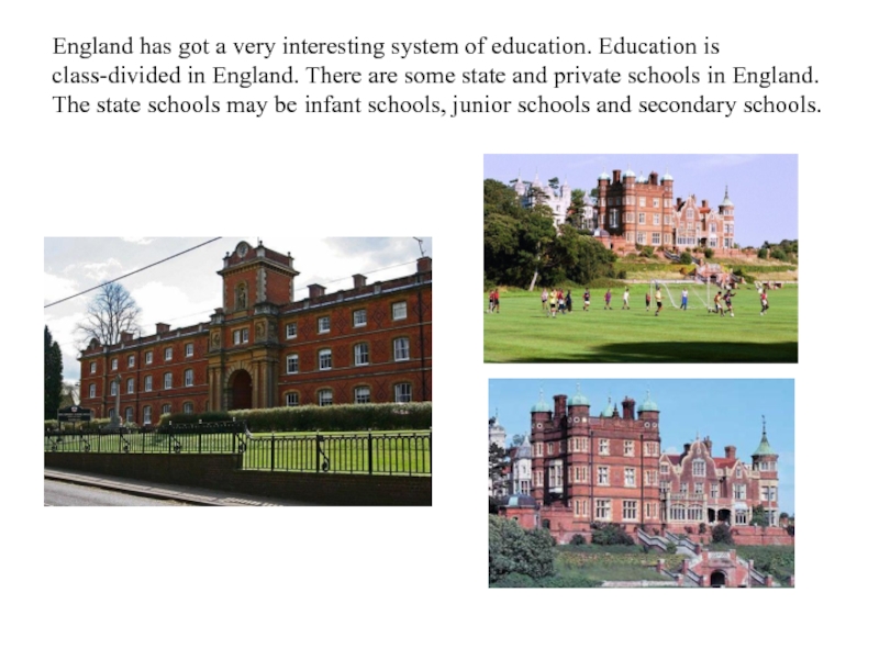 class-divided in England. There are some state and private schools in England. The state schools may be infant schools, junior schools and secondary schools.