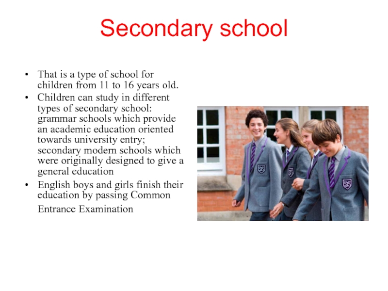 Children can study in different types of secondary school: grammar schools which provide an academic education oriented towards university entry; secondary modern schools which were originally designed to give a general education