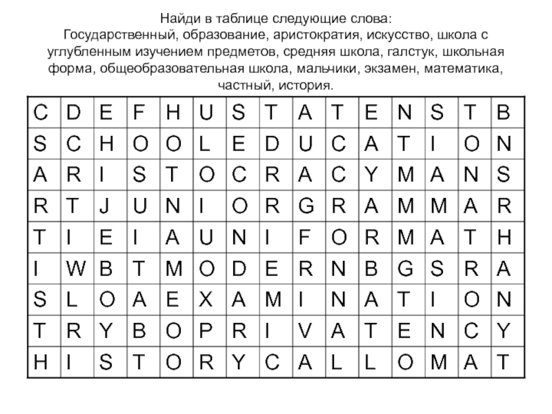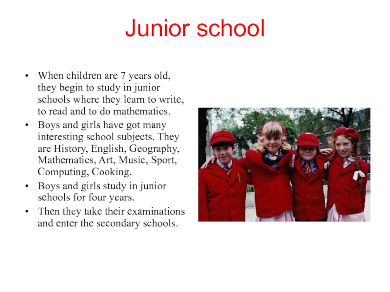 Boys and girls have got many interesting school subjects. They are History, English, Geography, Mathematics, Art, Music, Sport, Computing, Cooking.