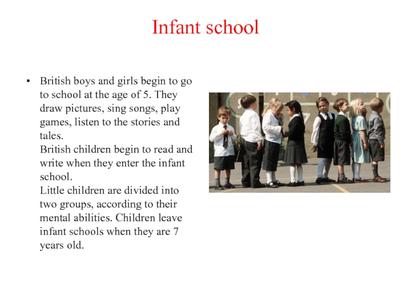 Little children are divided into two groups, according to their mental abilities. Children leave infant schools when they are 7 years old.