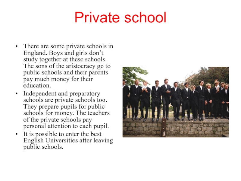 Independent and preparatory schools are private schools too. They prepare pupils for public schools for money. The teachers of the private schools pay personal attention to each pupil.
