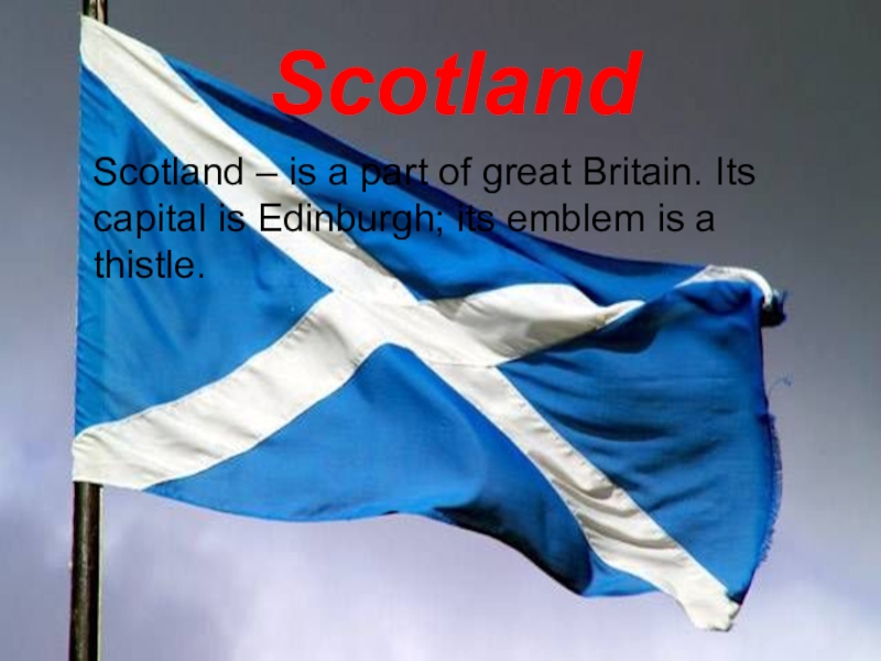 Scotland Scotland – is a part of great Britain. Its capital is Edinburgh; its emblem is a thistle.
