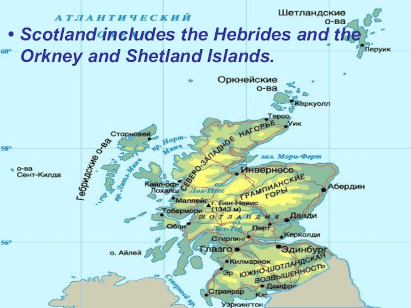 Слайд 4Scotland includes the Hebrides and the Orkney and Shetland Islands.
