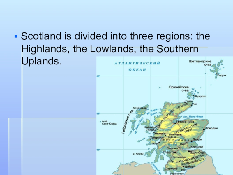 Слайд 5Scotland is divided into three regions: the Highlands, the Lowlands, the