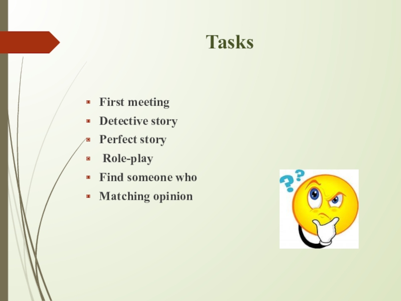 Tasks  First meetingDetective storyPerfect story Role-playFind someone whoMatching opinion