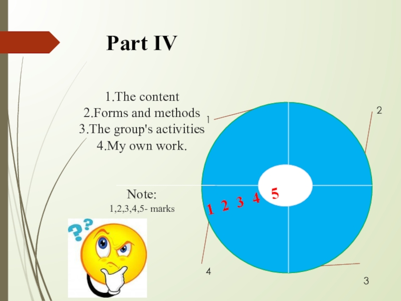 Слайд 12Part IV 1.The content 2.Forms and methods 3.The group's activities 4.My own work. Note: 1,2,3,4,5- marks