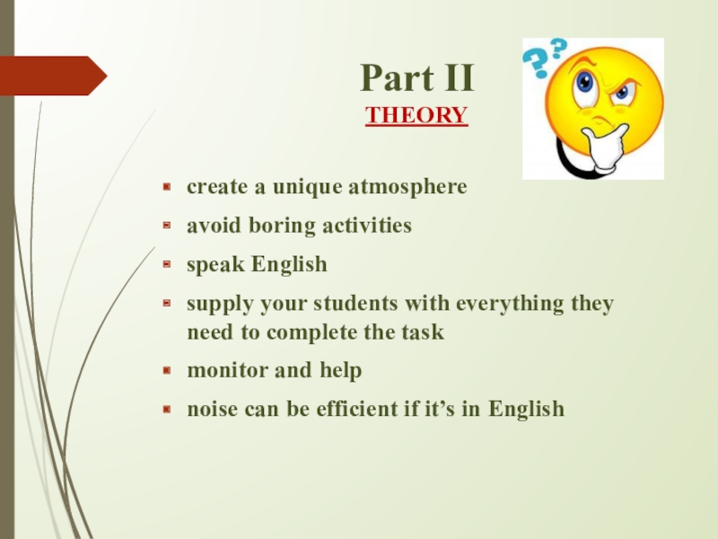 Part II THEORY  create a unique atmosphereavoid boring activitiesspeak English supply your students with everything they