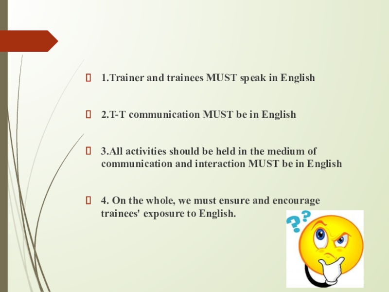 1.Trainer and trainees MUST speak in English2.T-T communication MUST be in English3.All activities should be held in