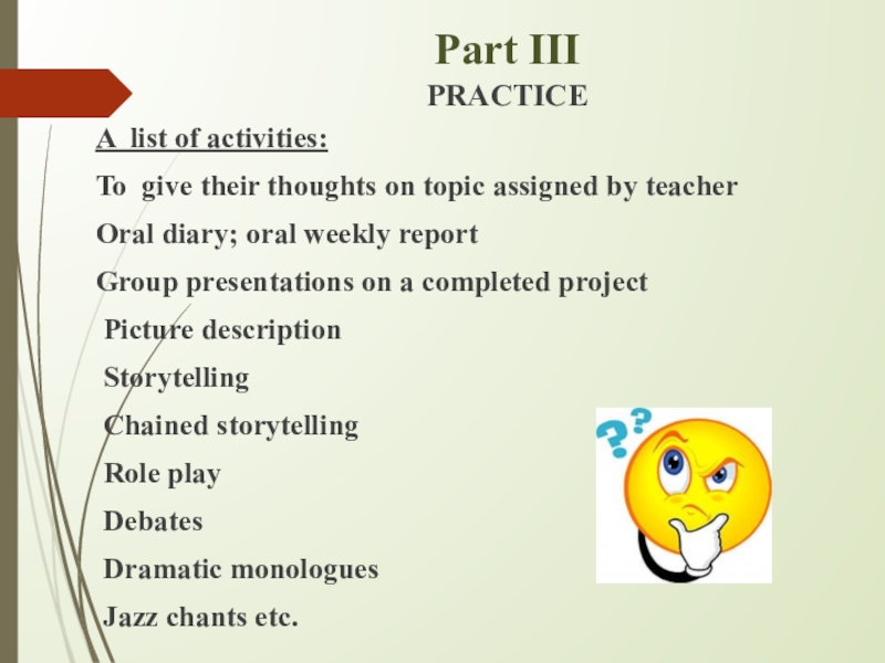 Part III PRACTICE  A list of activities: To give their thoughts on topic assigned by teacher