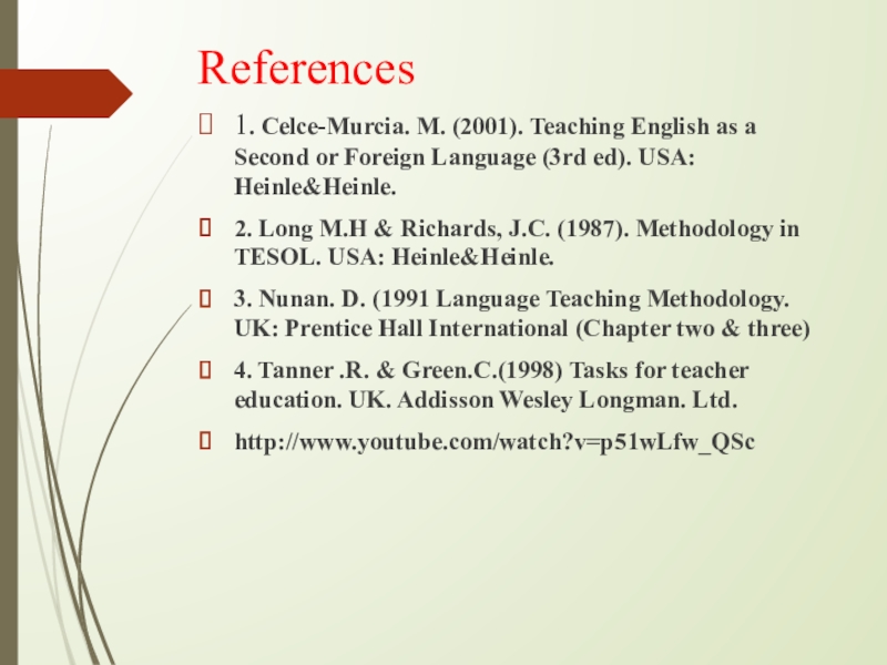 References 1. Celce-Murcia. M. (2001). Teaching English as a Second or Foreign Language (3rd ed). USA: Heinle&Heinle.