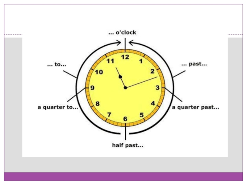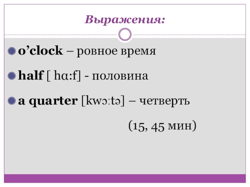 Выражения:o’clock – ровное времяhalf [ hα:f] - половинаa quarter [kwɔːtə] – четверть