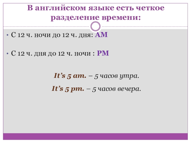 В английском языке есть четкое разделение времени:С 12 ч. ночи до 12 ч. дня: AMС 12 ч. дня до 12 ч. ночи : PM It’s 5 am. – 5 часов утра. It’s 5 pm. –