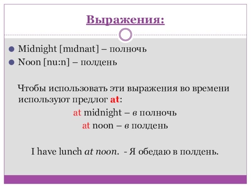 Выражения:Midnight [mıdnaıt] – полночьNoon [nu:n] – полдень  Чтобы использовать эти выражения во времени используют предлог at:at