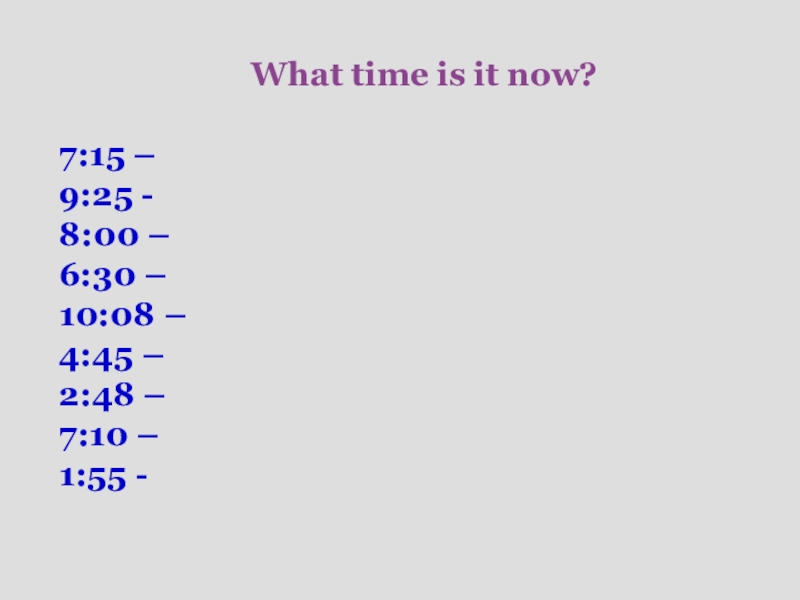 What time is it now? 7:15 – 9:25 - 8:00 – 6:30 – 10:08 – 4:45 – 2:48 – 7:10 – 1:55 -