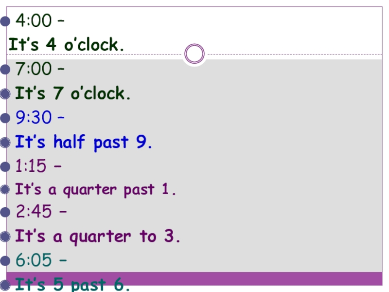 4:00 – It’s 4 o’clock.7:00 – It’s 7 o’clock.9:30 – It’s half past 9.1:15 – It’s a