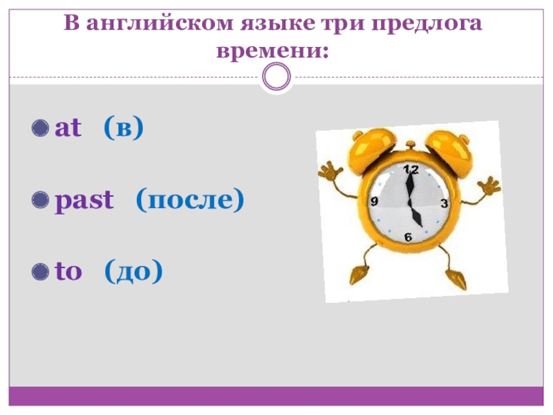 В английском языке три предлога времени:at  (в)past  (после)to  (до)
