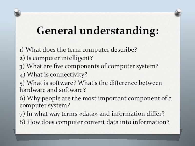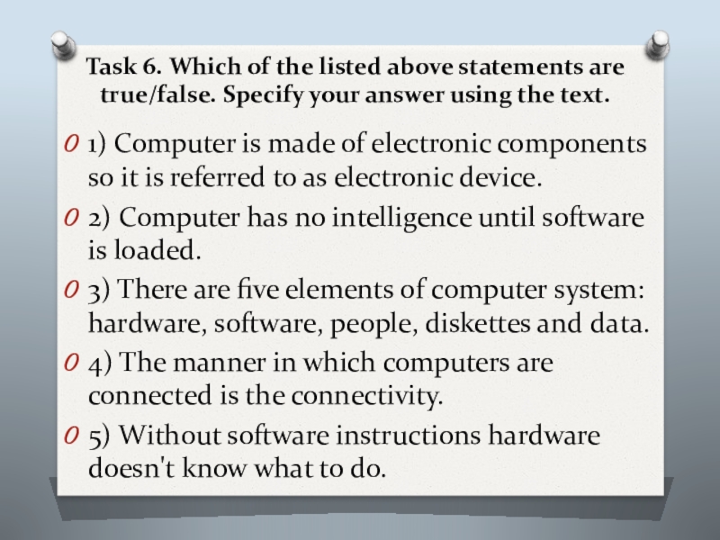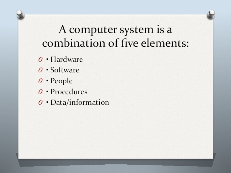 3) There are five elements of computer system: hardware, software, people, diskettes and data.