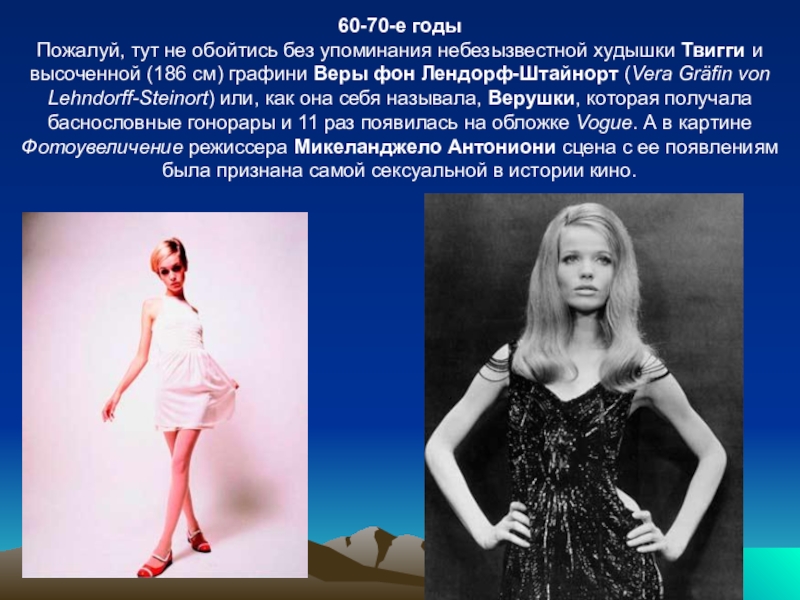 высоченной (186 см) графини Веры фон Лендорф-Штайнорт (Vera Gräfin von Lehndorff-Steinort) или, как она себя называла, Верушки, которая получала баснословные гонорары и 11 раз появилась на обложке Vogue. А в картине Фотоувеличение режиссера Микеланджело Антониони сцена с ее появлениям была признана самой сексуальной в истории кино.