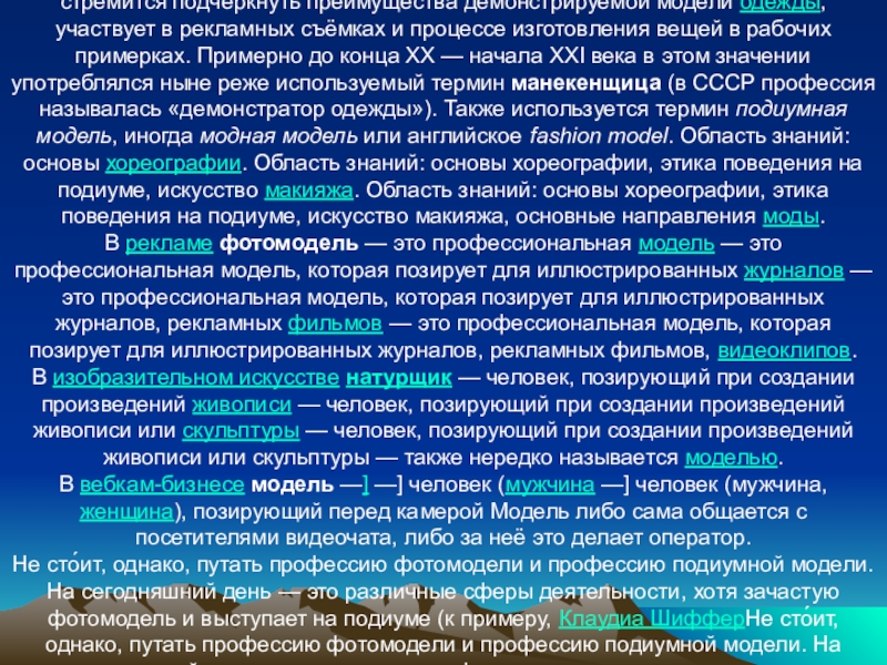 это человек — это человек (мужчина — это человек (мужчина, женщина — это человек (мужчина, женщина, ребёнок — это человек (мужчина, женщина, ребёнок), демонстрирующий модели одежды — это человек (мужчина, женщина, ребёнок), демонстрирующий модели одежды на показах; стремится подчеркнуть преимущества демонстрируемой модели одежды, участвует в рекламных съёмках и процессе изготовления вещей в рабочих примерках. Примерно до конца ХХ — начала XXI века в этом значении употреблялся ныне реже используемый термин манекенщица (в СССР профессия называлась «демонстратор одежды»). Также используется термин подиумная модель, иногда модная модель или английское fashion model. Область знаний: основы хореографии. Область знаний: основы хореографии, этика поведения на подиуме, искусство макияжа. Область знаний: основы хореографии, этика поведения на подиуме, искусство макияжа, основные направления моды.