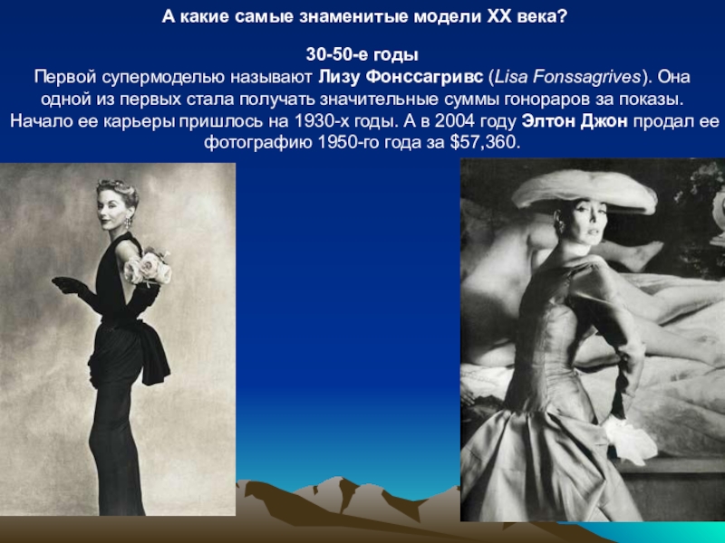 Фонссагривс (Lisa Fonssagrives). Она одной из первых стала получать значительные суммы гонораров за показы. Начало ее карьеры пришлось на 1930-х годы. А в 2004 году Элтон Джон продал ее фотографию 1950-го года за $57,360.