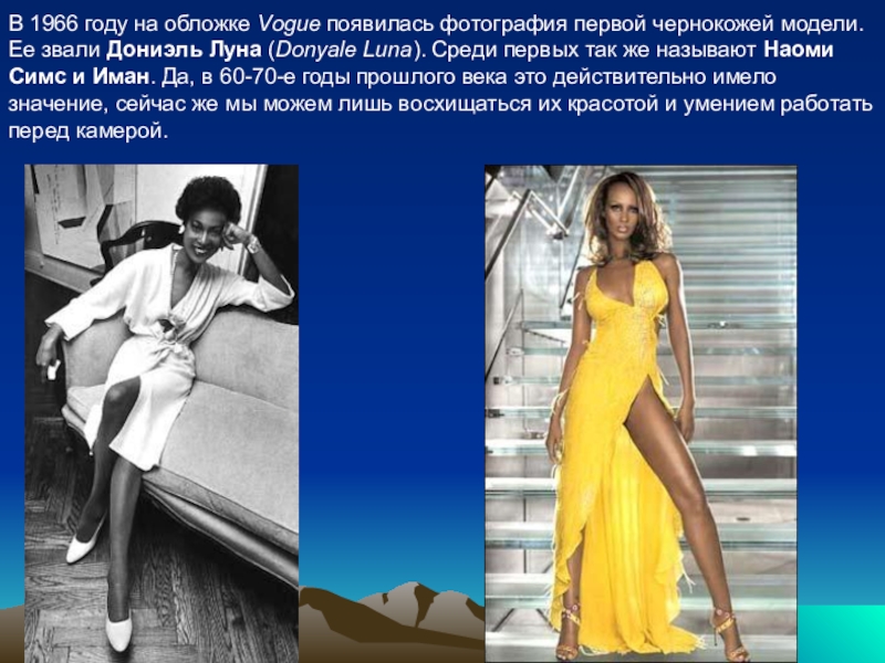 Ее звали Дониэль Луна (Donyale Luna). Среди первых так же называют Наoми Симс и Иман. Да, в 60-70-е годы прошлого века это действительно имело значение, сейчас же мы можем лишь восхищаться их красотой и умением работать перед камерой.