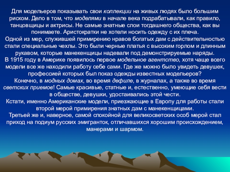 Слайд 11Для модельеров показывать свои коллекции на живых людях было большим риском.