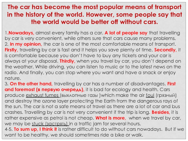 3. Оn the other hand, travelling by car has a number of disadvantages. First and foremost (в первую очередь), it is bad for ecology and health. Cars produce exhaust fumes (выхлопные газы )which make the air foul (грязный) and destroy the ozone layer protecting the Earth from the dangerous rays of the sun. The car is not a safe means of travel as there are a lot of car and bus crashes. Travelling by car is not very convenient if the trip is long. Besides, it is rather expensive as petrol is not cheap. What is more, when we travel by car, we may be stuck (застрять) in a traffic jam for several hours.