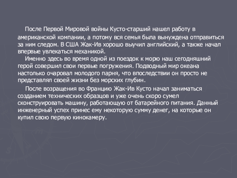 Слайд 5 После Первой Мировой войны Кусто-старший нашел работу в