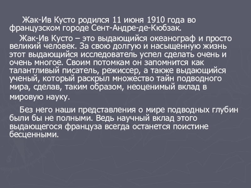 Жак-Ив Кусто родился 11 июня 1910 года во французском городе Сент-Андре-де-Кюбзак. Жак-Ив Кусто – это выдающийся океанограф и просто великий человек. За свою долгую и насыщенную жизнь этот выдающийся исследователь успел сделать