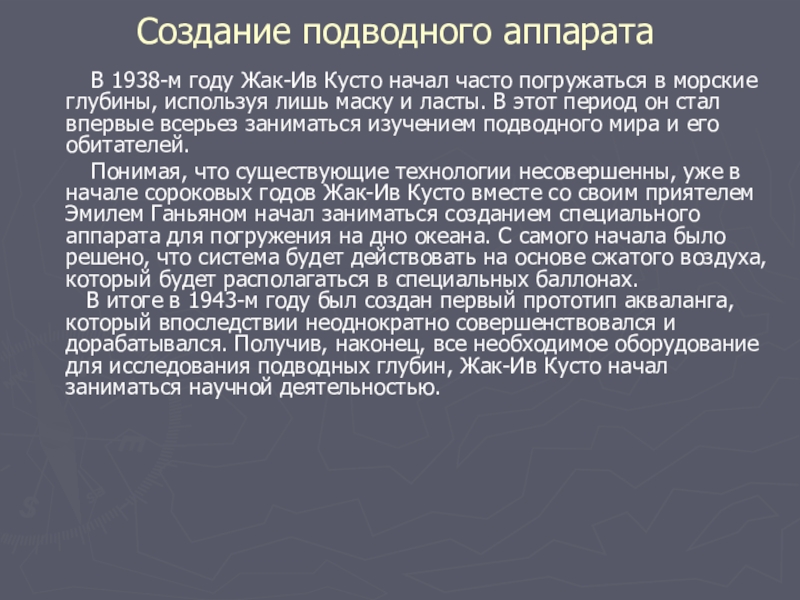 Создание подводного аппарата    В 1938-м году Жак-Ив Кусто начал часто погружаться в морские глубины,