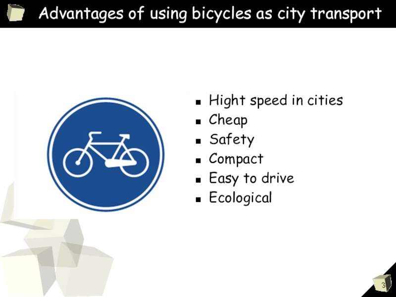 Слайд 3Advantages of using bicycles as city transport