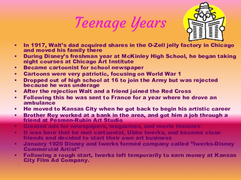 During Disney’s freshman year at McKinley High School, he began taking night courses at Chicago Art Institute