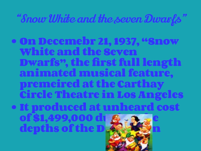 White and the Seven Dwarfs”, the first full length animated musical feature, premeired at the Carthay Circle Theatre in Los Angeles