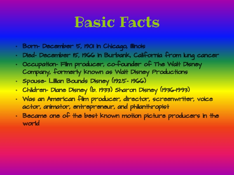 Occupation- Film producer, co-founder of The Walt Disney Company, formerly known as Walt Disney Productions