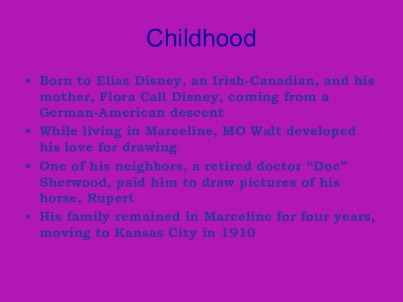 Born to Elias Disney, an Irish-Canadian, and his mother, Flora Call