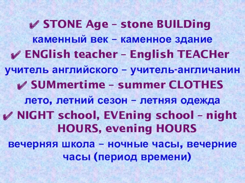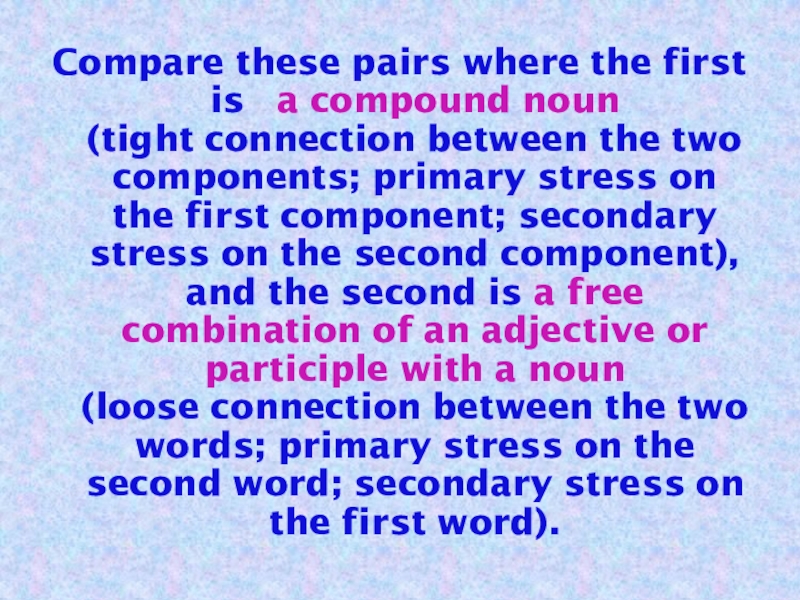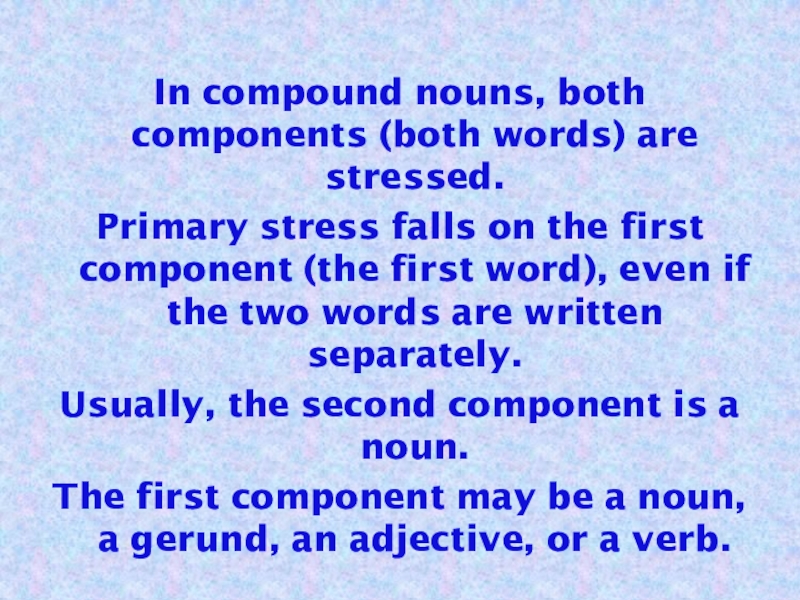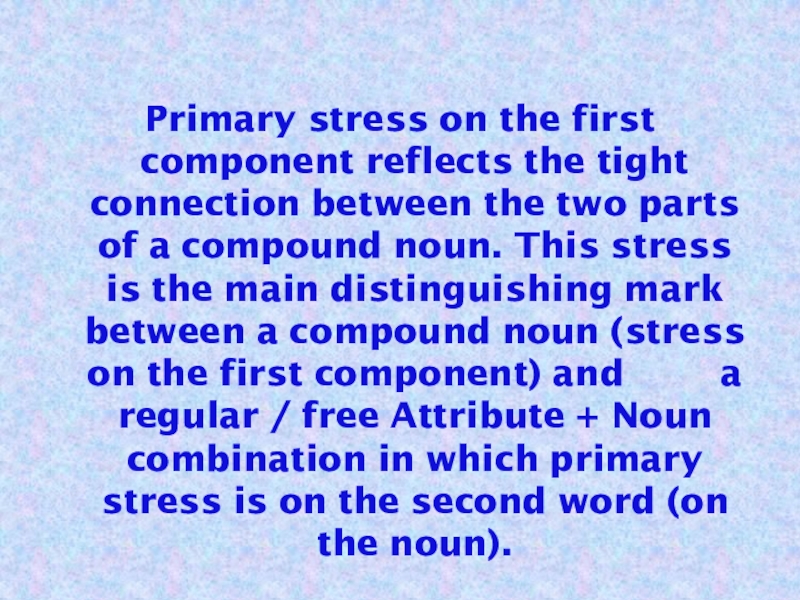 the two parts of a compound noun. This stress is the main distinguishing mark between a compound noun (stress on the first component) and a regular / free Attribute + Noun combination in which primary stress is on the second word (on the noun).